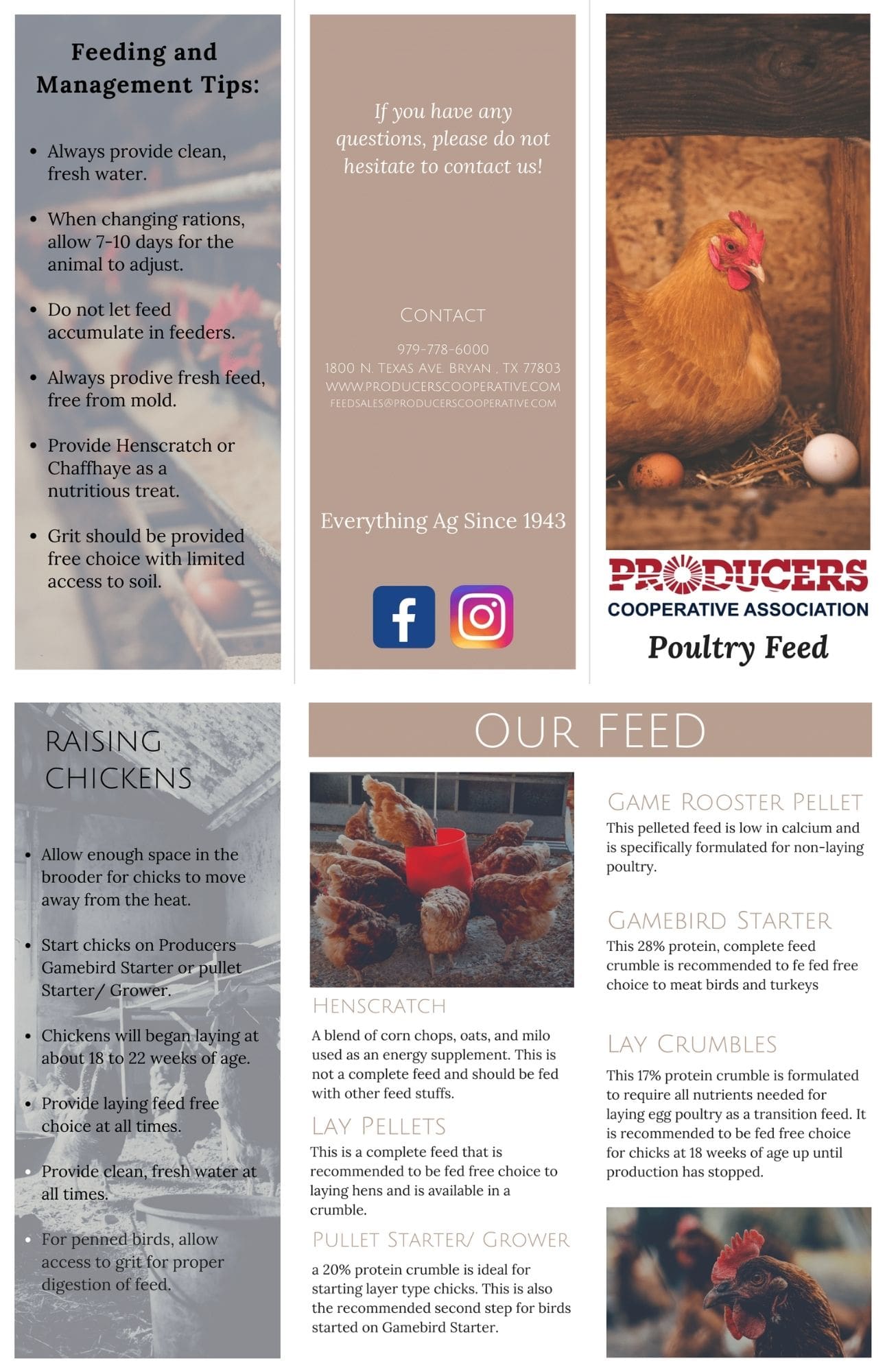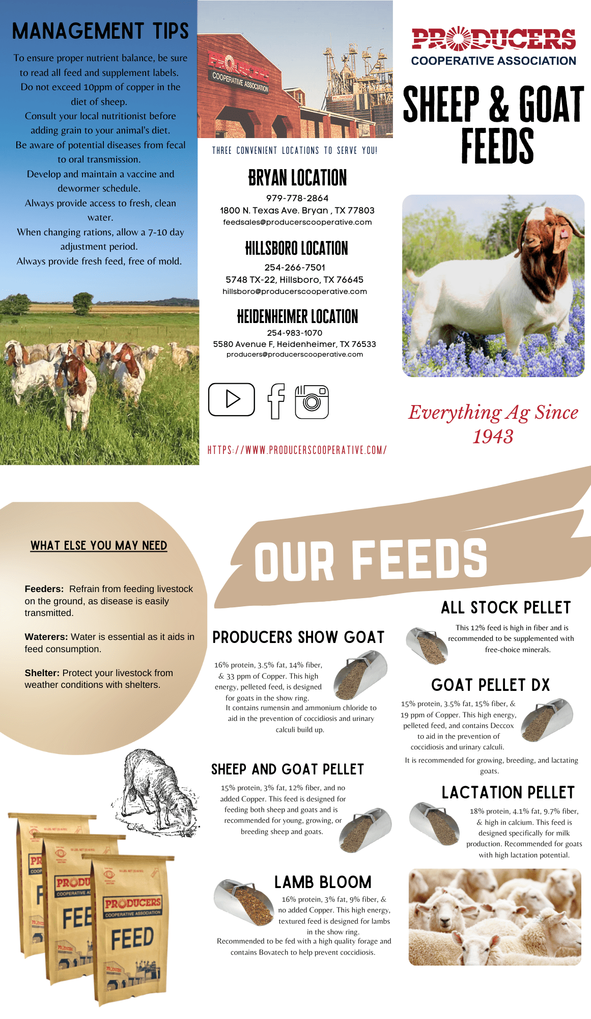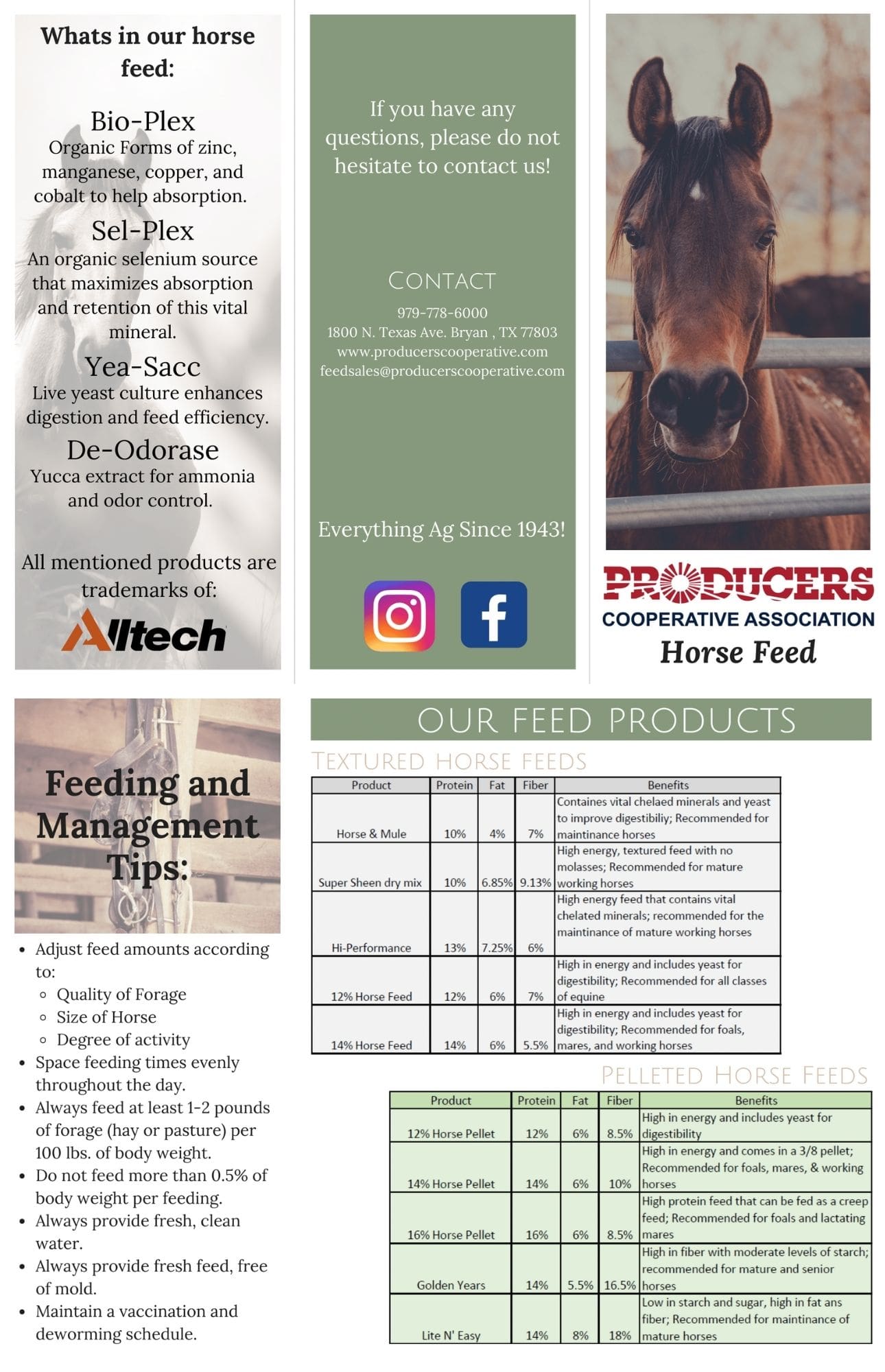 Ample supplies of these feeds are stored in our large warehouse for pickup on demand. A large delivery fleet also stands ready to deliver feed orders anywhere in the Brazos Valley. Our in-house nutritionist is personally available to provided one-on-one technical assistance to customers with special animal nutrition and health needs. Brazos Valley farmers and ranchers have trusted PRODUCERS to supply their feed needs since 1943.